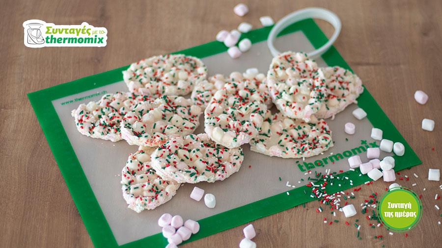 Προσθέστε 130 γρ. μαρσμέλοους και αναμείξτε 2 δευτερόλεπτα/ταχύτητα 2.5. Μεταφέρετε στο ταψί φούρνου που έχετε ετοιμάσει και απλώστε ομοιόμορφα, με τη βοήθεια της σπάτουλας, σχηματίζοντας ένα ορθογώνιο πάχους 1-1.5 εκ. (δεν χρειάζεται να καλύψετε όλο το ταψί). Γαρνίρετε με 25 γρ. χρωματιστό βερμιτσέλι και αφήστε για 10 λεπτά στην άκρη να πήξει.