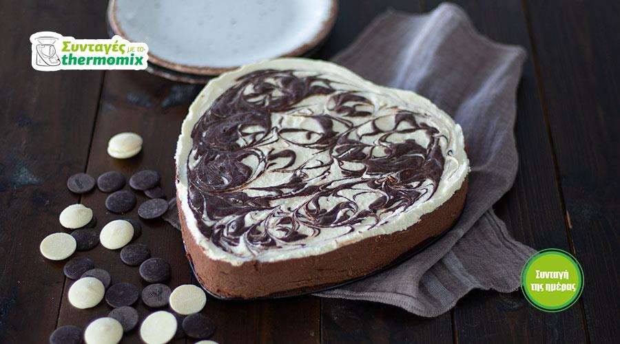 Αδειάστε από πάνω το μείγμα με την άσπρη σοκολάτα και απλώστε το ομοιόμορφα χρησιμοποιώντας την πίσω μεριά ενός κουταλιού. Από πάνω, γαρνίρετε με τις δύο κουταλιές της λιωμένη σοκολάτας κουβερτούρας που αφήσετε στην άκρη και με τη βοήθεια μιας οδοντογλυφίδας, κάντε κυκλικές κινήσεις, δίνοντας έτσι τα επιθυμητά σχήματα.