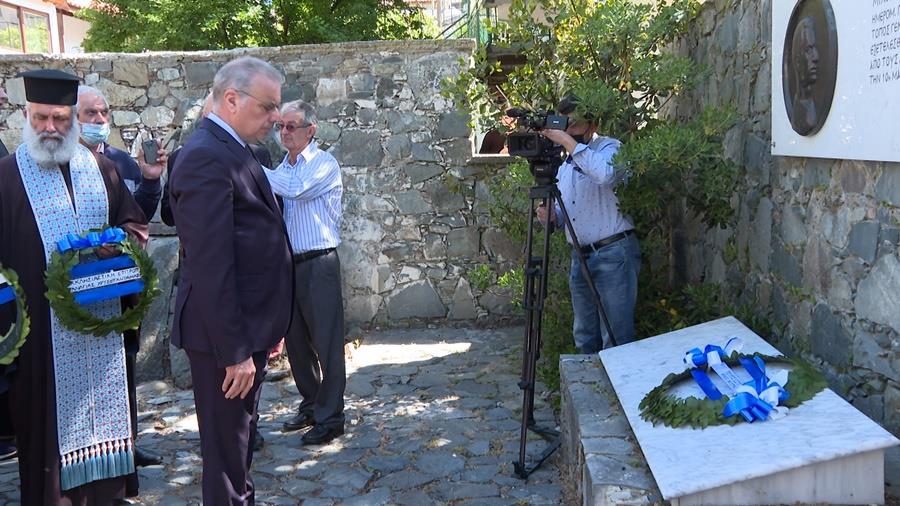 "Μνημονεύουμε τους ακατάβλητους και απαράμιλλους αγωνιστές της θρυλικής ΕΟΚΑ Μιχαλάκη Καραολή και Ανδρέα Δημητρίου που με την θυσία τους λάμπρυναν το Πάνθεο των Αθανάτων Αγωνιστών του Έθνους μας, τιμώντας την πατρίδα. Συνείδηση εθνικής ευθύνης και συναίσθηση ιστορικού χρέους μας οδήγησαν σ’ αυτή την μυσταγωγία", είπε.