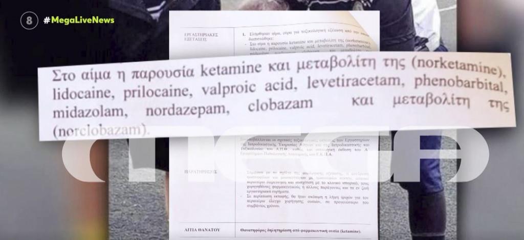 Σύμφωνα πάντα με όσα αποκαλύπτει το MEGA, ο ποσοτικός προσδιορισμός των ανιχνευθέντων ουσιών στο μεταθανάτιο δείγμα αίματος έδειξε ότι η συγκέντρωσης της κεταμίνης ήταν ίση με 6,5 mg/Ml. Η ευρεθείσα αυτή συγκέντρωση είναι στο εύρος σύμφωνα με τον ιατροδικαστή των συγκεντρώσεων του φαρμάκου σε δείγματα μεταθανάτιου αίματος θανατηφόρων περιστατικών που σχετίζονται με τη χρήση κεταμίνης.