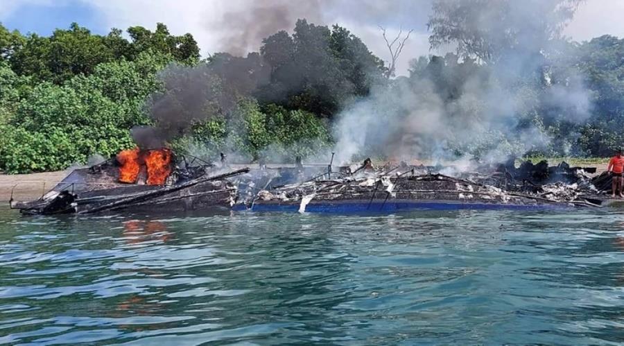 Πυκνός μαύρος καπνός υψωνόταν από το διώροφο σκάφος καθώς οι φλόγες το κατέτρωγαν ολόκληρο, δείχνουν εικόνες που δημοσιοποίησε η ακτοφυλακή.