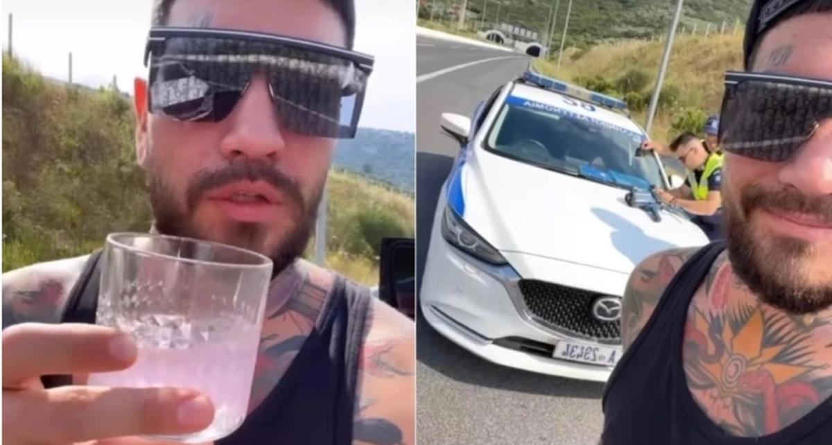 Η τροχαία σταμάτησε το αυτοκίνητο και τους «έκοψε» κλήση, με τον Snik να τραβάει βίντεο και να πίνει το ποτό του από το γυάλινο ποτήρι που κρατούσε.