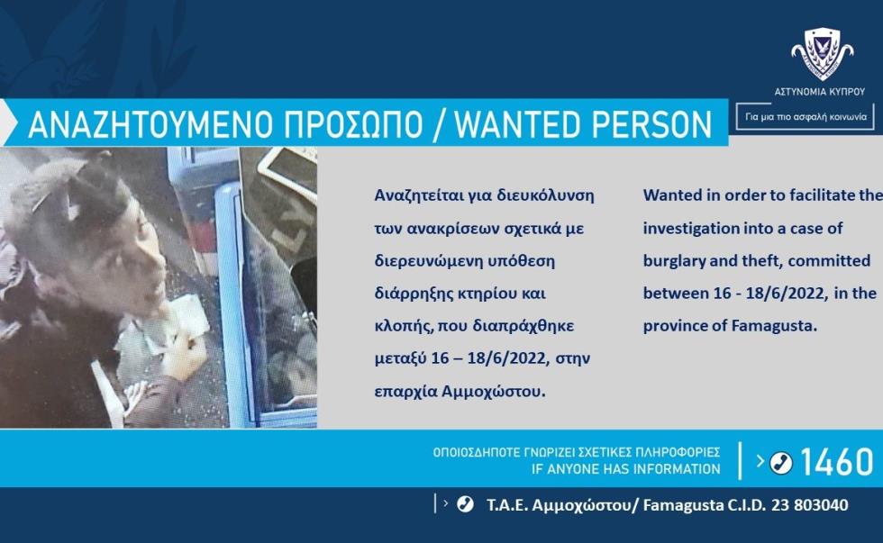 Παρακαλείται οποιοσδήποτε γνωρίζει οτιδήποτε που μπορεί να βοηθήσει στον εντοπισμό του, να επικοινωνήσει με το ΤΑΕ Αμμοχώστου, στο τηλέφωνο 23-803040 ή με τη Γραμμή του Πολίτη, στον τηλεφωνικό αριθμό 1460 ή με τον πλησιέστερο Αστυνομικό Σταθμό.