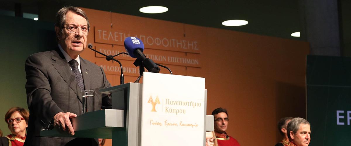 «Είναι πεποίθησή μας ότι η χώρα μας μπορεί να καταστεί περιφερειακό κέντρο ποιοτικών ευκαιριών πανεπιστημιακής εκπαίδευσης, έρευνας, αριστείας και διά βίου μάθησης σε τομείς αιχμής». Αυτό ανέφερε ο Πρόεδρος της Δημοκρατίας, Νίκος Αναστασιάδης, κατά τον χαιρετισμό του στην τελετή αποφοίτησης του Πανεπιστημίου Κύπρου (ΠΚ), παραθέτοντας τις ενέργειες της πολιτείας για τη στήριξη της τριτοβάθμιας εκπαίδευσης στη χώρα, και ιδιαίτερα του ΠΚ.