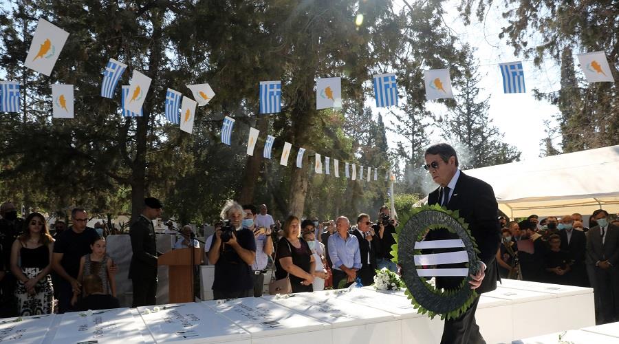 Προσθέτοντας ότι «αποτελεί χρέος μας προ τους πεσόντες ο διαρκής αγώνας για απαλλαγή από την κατοχή. Η θυσία των ηρώων θα δικαιωθεί όταν απαλλαγούμε από την κατοχή μέσω μίας λύσης που θα αποκαθιστά την κυριαρχία και την ανεξαρτησία της Κυπριακής Δημοκρατίας, χωρίς την παρουσία εγγυητικών στρατών και εποίκων. Μία λύση όπου η δημοκρατία και τα δημοκρατικά δικαιώματα για όλους του πολίτες θα είναι αδιαπραγμάτευτα.