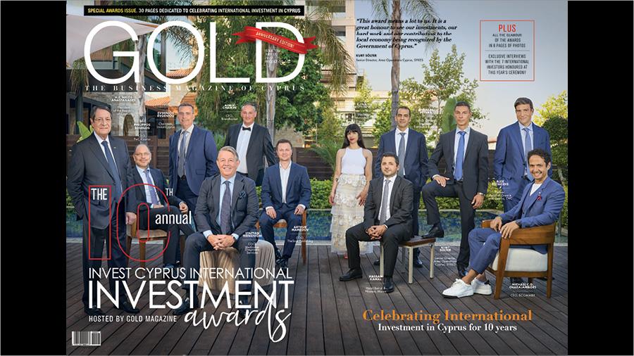 Στο νέο τεύχος του περιοδικού GOLD, που κυκλοφορεί αυτή την Κυριακή 17 Ιουλίου σε έντυπη και σε ψηφιακή έκδοση, παρουσιάζεται ένα μοναδικό αφιέρωμα 30 σελίδων με φωτογραφίες από την εκδήλωση και συνεντεύξεις με τους εκπροσώπους των βραβευμένων εταιρειών, καθώς και τους χορηγούς των 10ων Invest Cyprus International Investment Awards, που συνέβαλαν με τη σειρά τους στην υλοποίηση του οράματος αυτού για άλλη μια φορά.