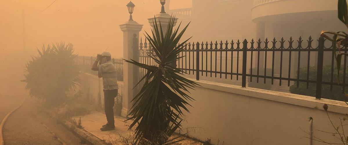 Όπως φαίνεται και από τις φωτογραφίες, ένας ηλικιωμένος κλείνει τα μάτια με τα χέρια του εξαιτίας του έντονου καπνού.