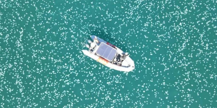 Ένα απόκοσμο θέαμα με τη θάλασσα διάστικτη από άσπρα σημάδια, που δεν ήταν παρά ένα τεράστιο κοπάδι μέδουσες, έκανε την εμφάνισή του ανοικτά των ακτών της Χάιφα στο Ισραήλ.