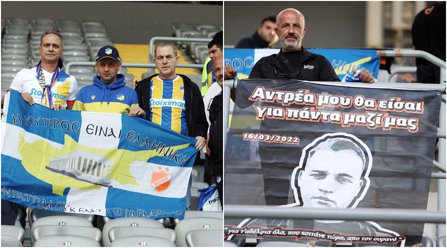 Δίπλα στην ομάδα τους στο Καζακστάν στέκονται οι οπαδοί του ΑΠΟΕΛ. Μερικές δεκάδες οπαδοί ακολούθησαν την ομάδα στο μακρινό ταξίδι και έβαψαν το κομμάτι που δικαιούνταν να βρεθούν φίλοι των γαλαζοκιτρίνων, με πορτοκαλί χρώμα.