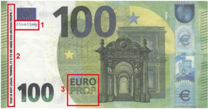 2. Έχουν εκτυπωμένη την επιγραφή “THIS IS NOT LEGAL TENDER , IT S TO BE USED FOR MOTION PROPS ” , στην θέση των αρχικών της Ευρωπαϊκής Κεντρικής Τράπεζας στην αριστερή άκρη του χαρτονομίσματος τα οποία απουσιάζουν. (Σημείο 2).