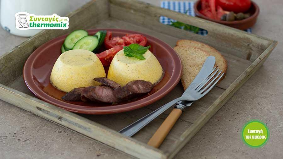 Προσθέστε 6 αυγά, 240 γρ. γάλα, 1 πρέζα αποξηραμένο δυόσμο, 1 πρέζα αλάτι, λίγο πιπέρι αλεσμένο και αναμείξτε 1 λεπτό/ταχύτητα 4. Μεταφέρετε το μείγμα στις 4 φόρμες που ετοιμάσατε. Καλύψτε τις φόρμες με πλαστική μεμβράνη. Ξεπλύνετε τον κάδο.