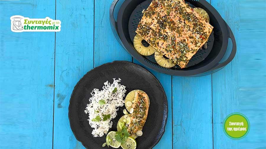 Βάλτε στον κάδο τα 30 γρ. χυμό ανανά, που αφήσατε στην άκρη, 60 γρ. sweet chilli sauce, 20 γρ. φρέσκο κόλιανδρο, 3 σκελίδες σκόρδο, 20 γρ. φρέσκο τζίντζερ, 35 γρ. σησαμέλαιο, 15 γρ. χυμό λάιμ, 1 /2 κουταλάκι νιφάδες κόκκινου πιπεριού και κόψτε 10 δευτερόλεπτα/ταχύτητα 5. Με ένα πινέλο ζαχαροπλαστικής αλείψτε ή γαρνίρετε το φιλέτο σολομού με το μείγμα.
