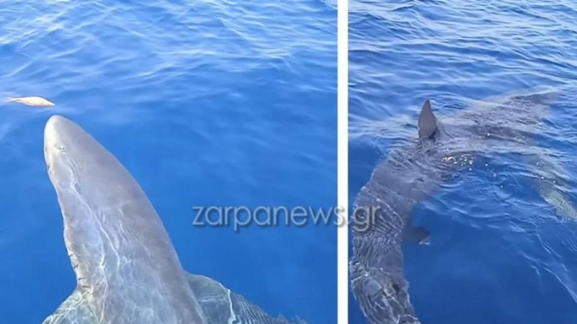 Οι άνδρες που βρίσκονταν πάνω στο σκάφος απαθανάτισαν με τα κινητά τους τηλέφωνα τη μοναδική και συνάμα... τρομακτική στιγμή, ενώ δεν δίστασαν να τον χαϊδέψουν και να τον ταΐσουν ψαράκια και γαρίδες, παίζοντας τη ζωή τους κορώνα-γράμματα!